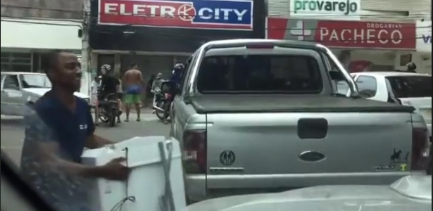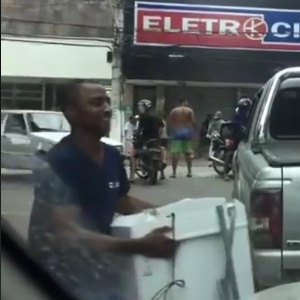 Sorridente, o vigia aparece carregando o eletrodoméstico em um vídeo que circulou pelas redes sociais. "Um parente da minha ex espalhou para geral", disse ao UOL. Além de Cachoeiro de Itapemirim, que conta com 163 mil habitantes, as imagens de Silva se espalharam pelo Brasil. Um dia após o saque, Silva se apresentou à delegacia da cidade e devolveu a máquina de lavar."Família e amigos, foi só um impulso. Não sou ladrão, safado, assaltante", escreveu no Facebook dois dias depois de ter feito a devolução.Reprodução/UOLGeter Silva aparece no vídeo que circulou nas redes