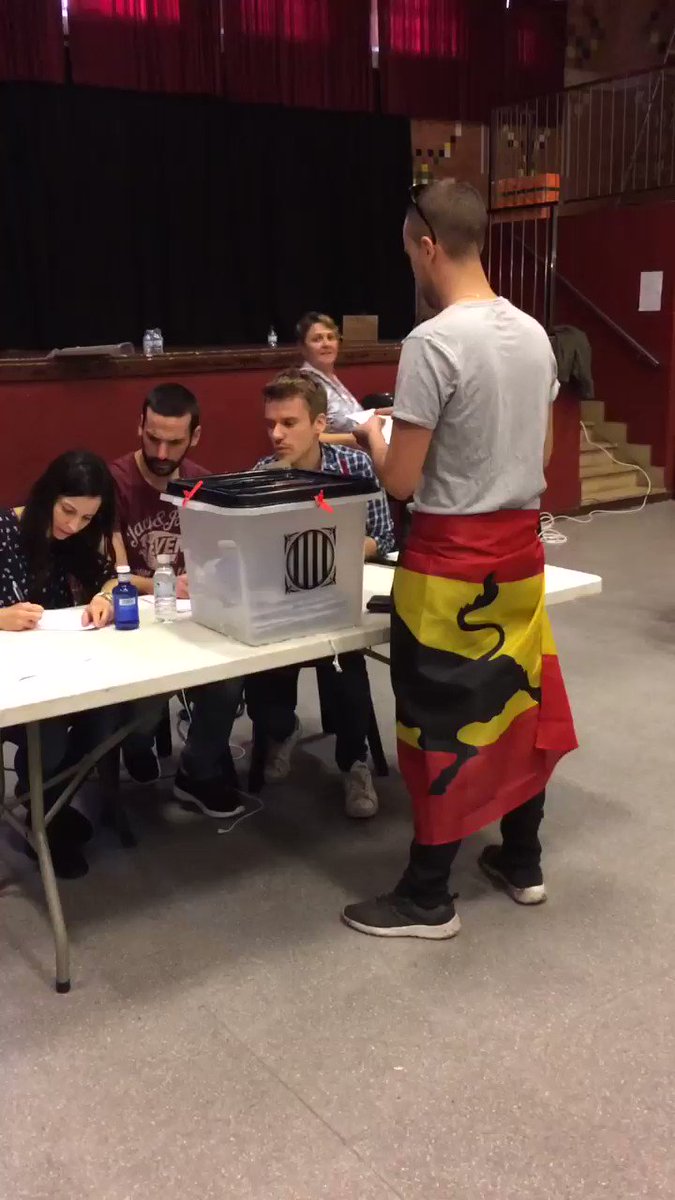 Votando con la bandera española. En un centro de votación de Torrefarrera (Lleida), un usuario de Twitter ha grabado este mediodía el momento en el que un joven vota con la bandera española y es aplaudido por ello.
