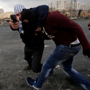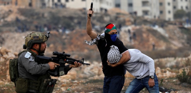 Agente israelense, infiltrado em um protesto palestino, aponta arma para fotógrafo da agência Reuters durante manifestação próximo a Ramallah, na Cisjordânia